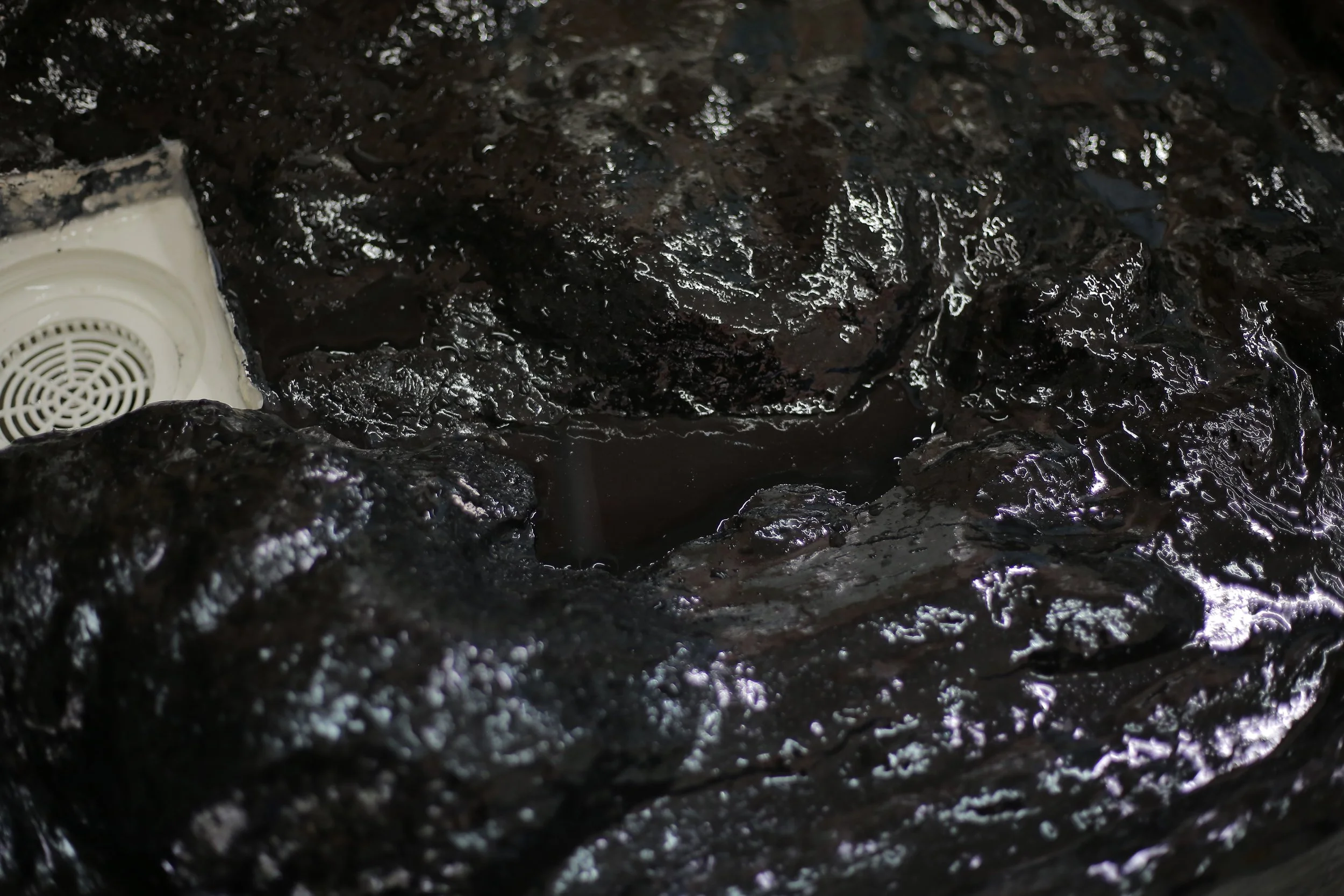 TEST-OPERATE-TEST-MECHANISM (detail), 2021. Timber, curtain rods, polyester blend curtains, dye sublimation print on polyester with hot seal, plaster of Paris, epoxy resin, cheesecloth, polyurethane, dance-time satin, polyvinyl chloride pipes, Solar-shield stain, water, shower head, drainage system, custom shallow bucket, and motorised water pump. Dimension variables.
