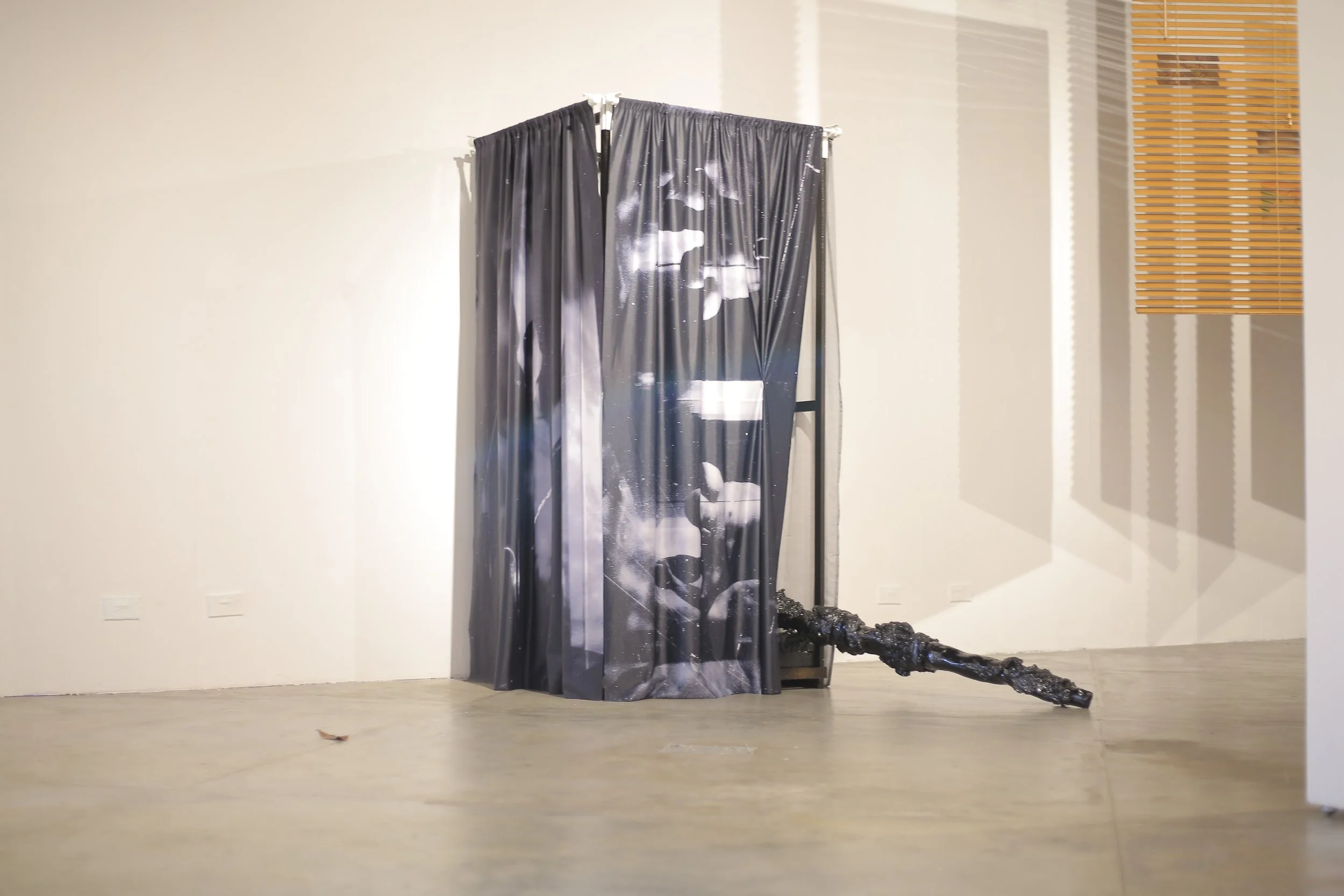 TEST-OPERATE-TEST-MECHANISM, 2021. Timber, curtain rods, polyester blend curtains, dye sublimation print on polyester with hot seal, plaster of Paris, epoxy resin, cheesecloth, polyurethane, dance-time satin, polyvinyl chloride pipes, Solar-shield st