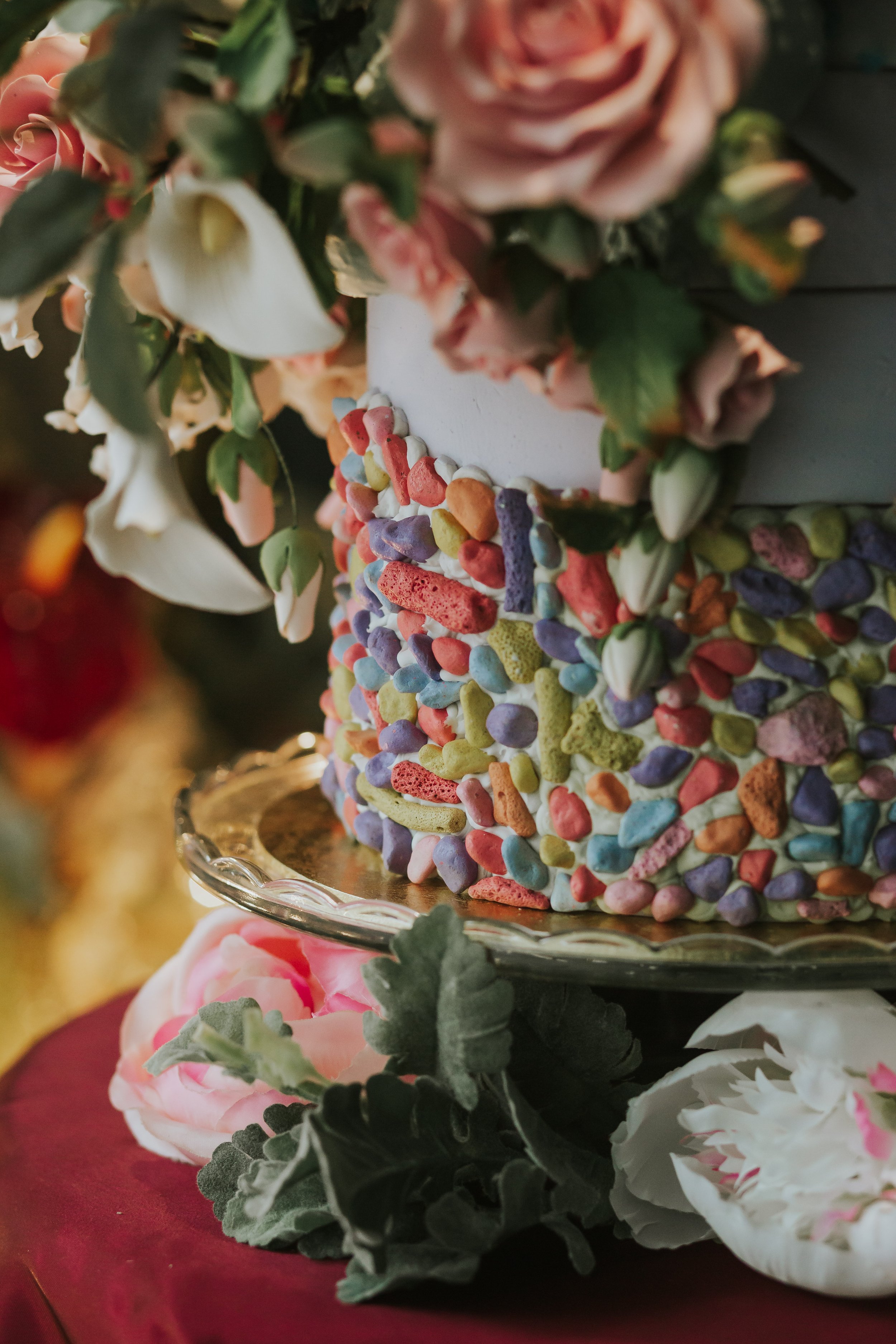 SEASON-LESS DESIRES (detail), 2022. Polyurethane, polystyrene fibres, silicone, K9 crystals, glass beads, sequins, Swarovski crystals, Duchess satin, hand sewn lace, chiffon, cotton thread, gum-paste, floral wire, epoxy resin, synthetic polymer paint, wooden side table, glass cake platter, polyester curtain, curtain rods, curtain hangers, paper dolly, cardboard cake board, silk flowers, silk foliages, electrical circuit component, flat-weaves, and chandelier. Variable Dimensions.
